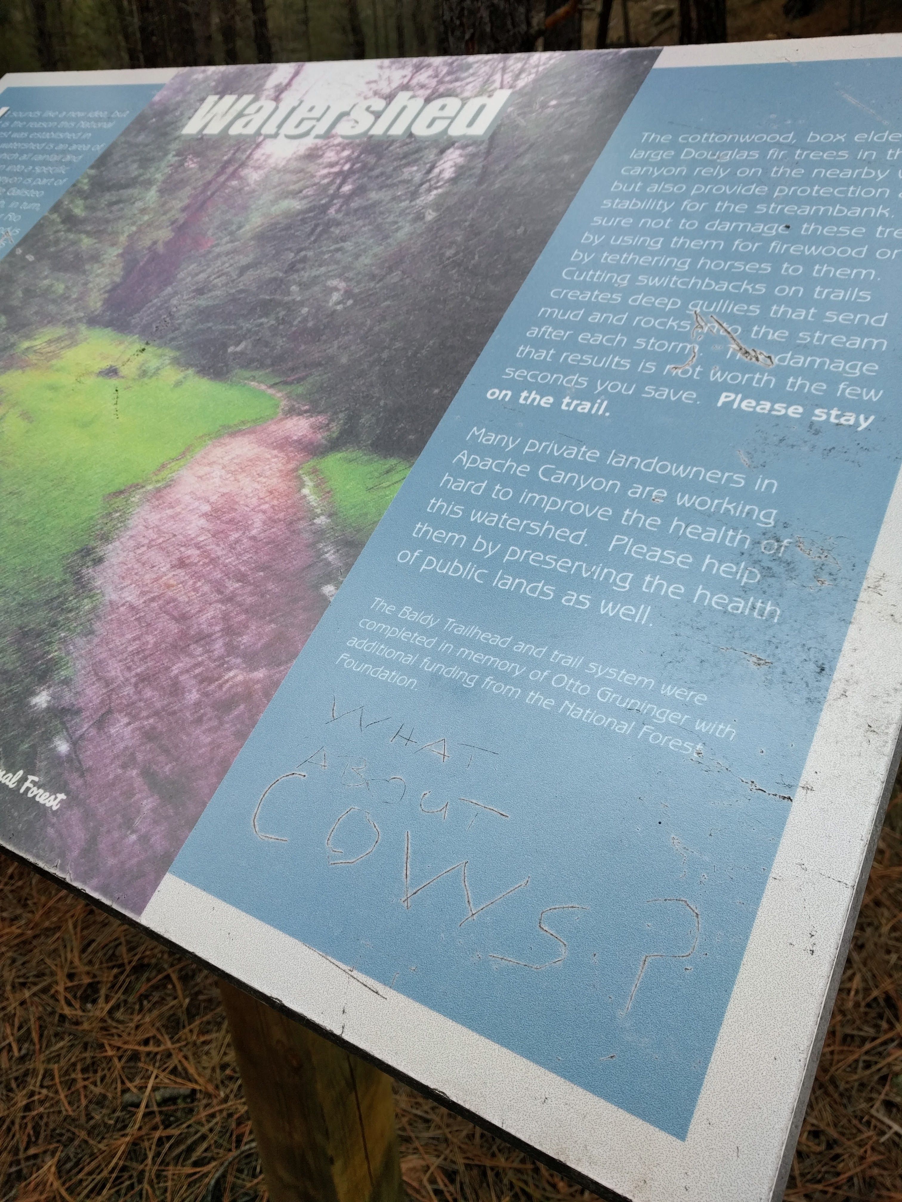 This is good and I support protecting the environment, but what about the cows? No really, why are there signs up along trails reminding users to stay on the trail, when the entire area is turned to powder due to cows grazing in the desert.